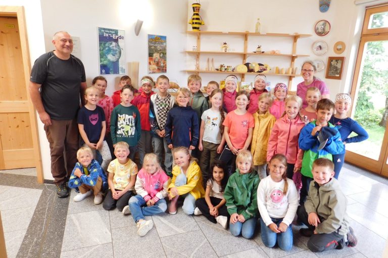 Die Klasse 1 machte sich auf den Weg nach Kirchberg, um dort mit Imker Franz Rothkopf einiges über Bienen, ihren Stock und den leckeren Honig zu lernen.
